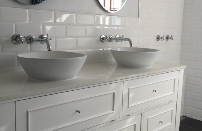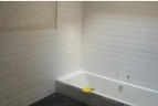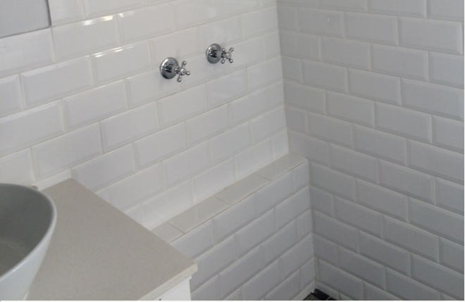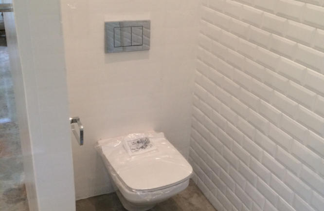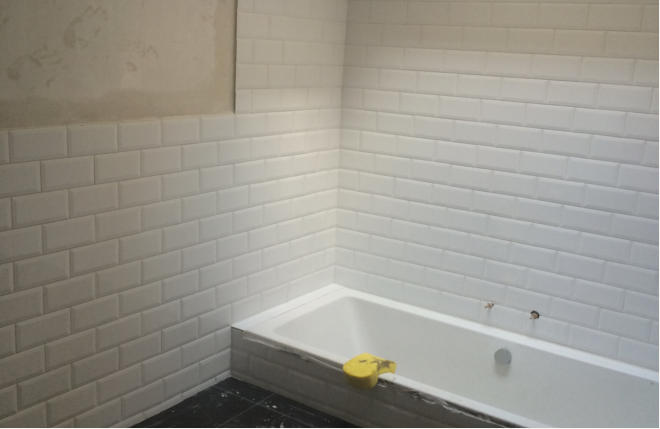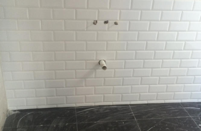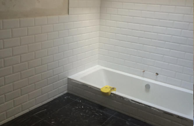 new the new layout of the bathroom. The walls white subway tiles and the floors